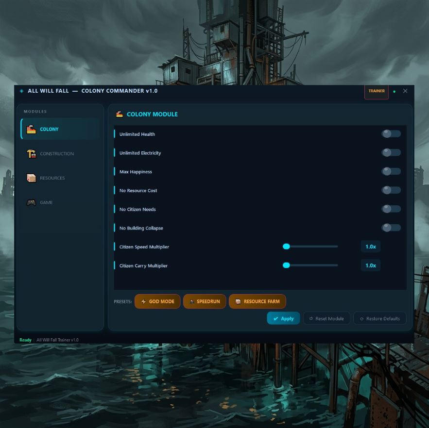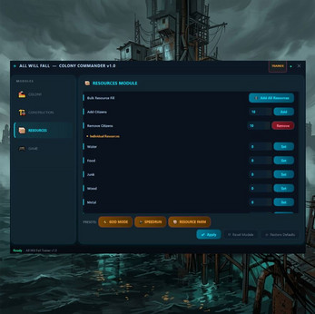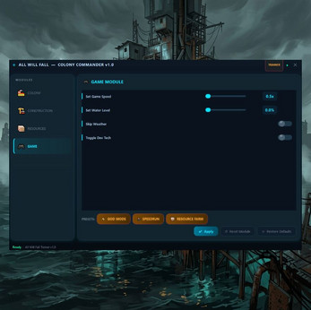 | Tags | all-will-fall, allwillfall, cheat, cheats, menu, mod, script, tool, trainer |